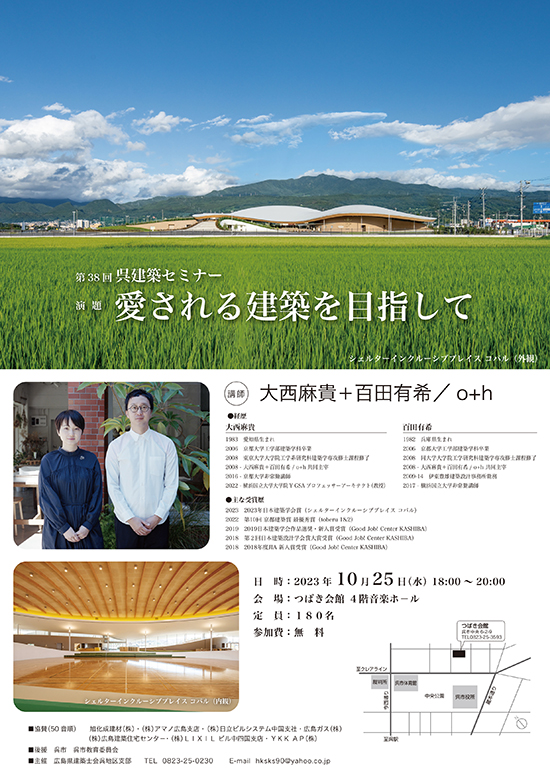 今年も呉建築セミナー開催します。 講師に大西麻貴・百田有希ご夫妻をお招きし10月25日(水曜日)つば…