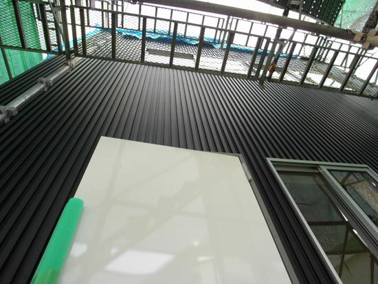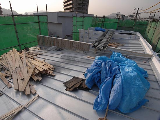 風の回る家の今日の現場風景です。床のフローリングは張られ現在は養生で覆われています。外壁もモルタル部…
