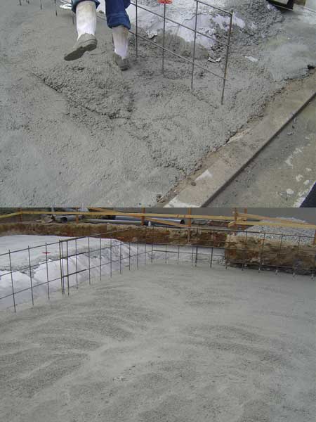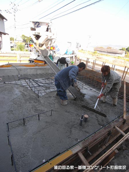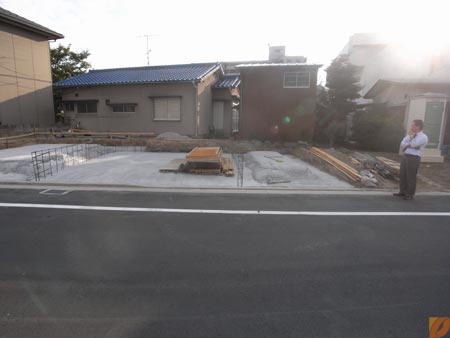 先日の現場の状況です。基礎を打つ前の下地の捨てコンクリート打設後の状況です。一部基礎に段差があるため…