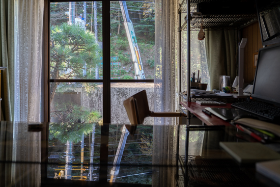 電柱改修のため事務所は朝から停電になりました。 窓の外には高所作業車が陣取って作業員の方々がんばって…